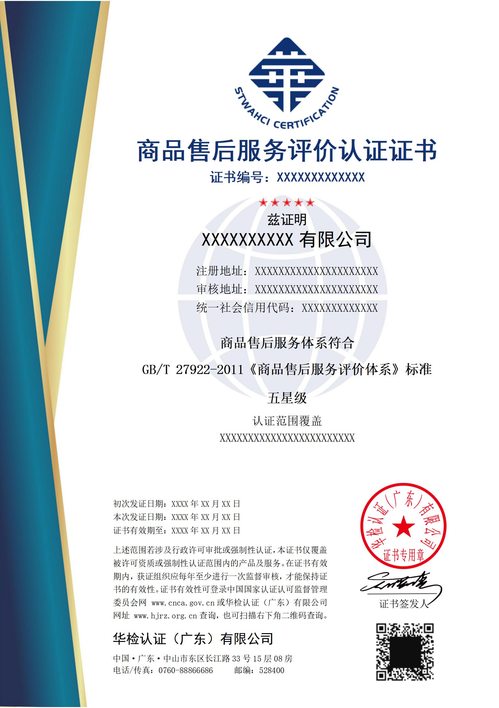 售后服務體系完善程度認證證書